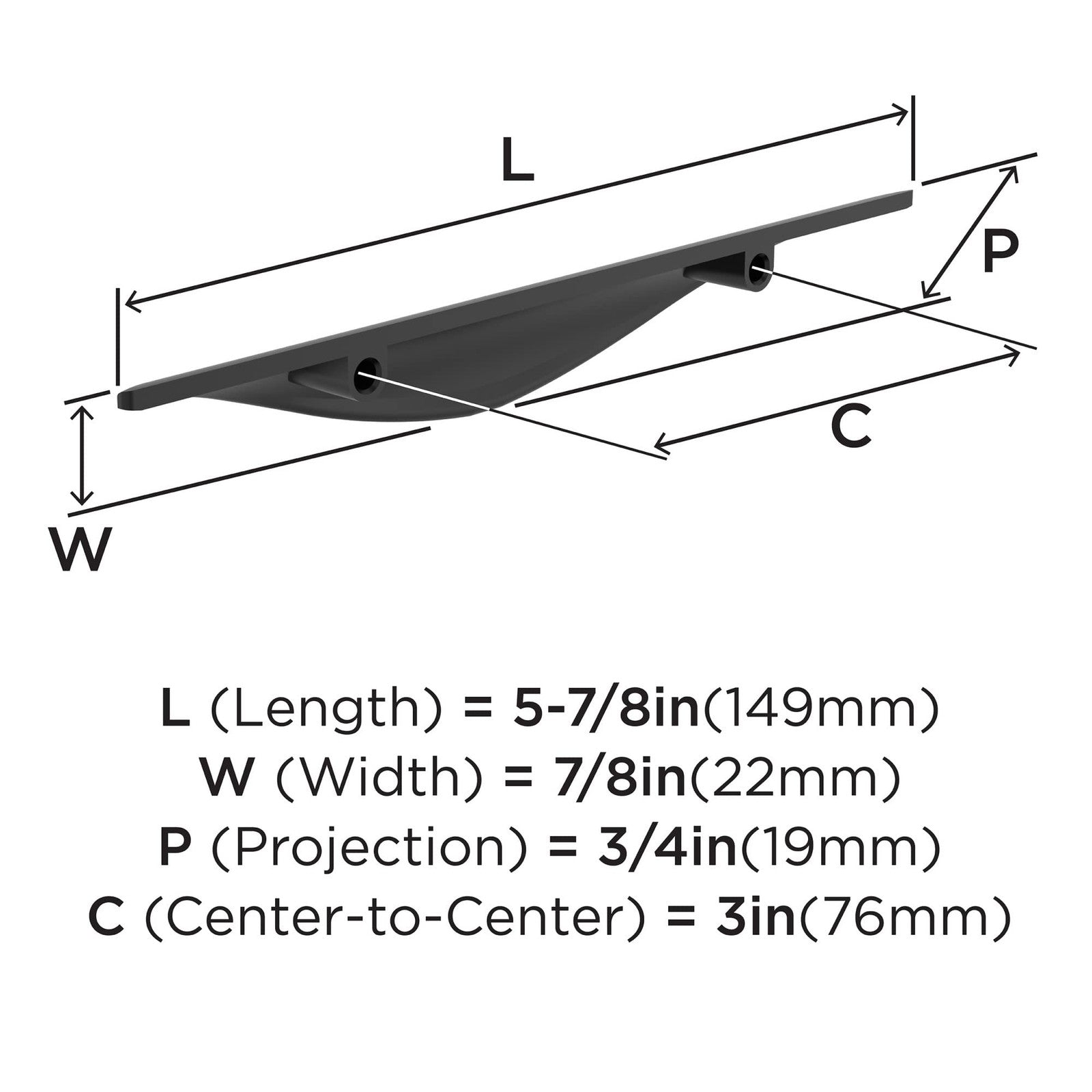 Features: Constructed of zinc for durability and dependability All necessary mounting hardware is included Includes a single (1) pull Dimensions: Center to Center: 3" Length: 5-7/8" Width: 7/8" Projection: 3/4"