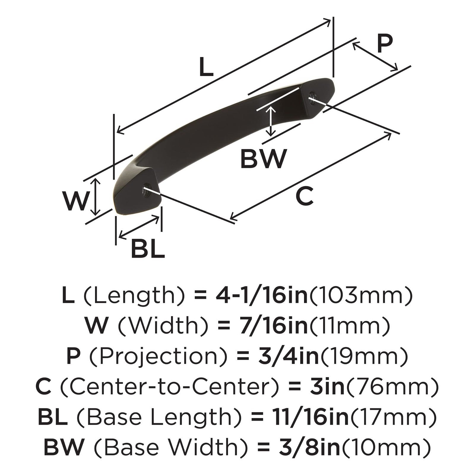 Features: Constructed of zinc for durability and dependability All necessary mounting hardware is included Includes a single (1) pull Dimensions: Center to Center: 3" Length: 4-1/16" Width: 7/16" Projection: 3/4"